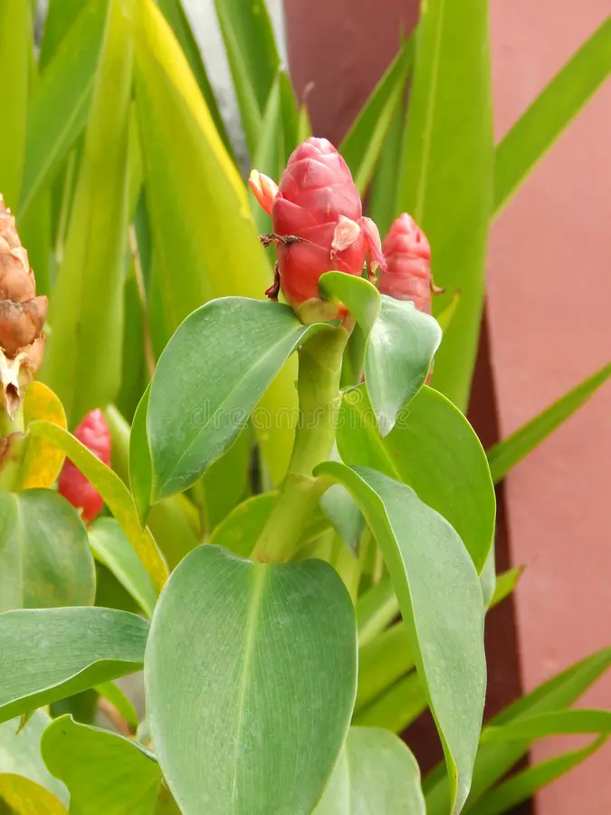 Bunga: Tercapai dalam struktur kerucut (5–27 cm), braktea merah/hijau; bunga oranye-merah keluar satu per satu