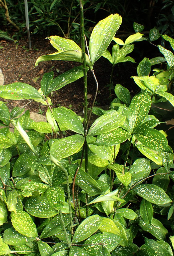 Daun: Daun berlapis tebal, kulit halus, berbentuk elips atau ovata dengan ujung lancip (mucronate). Daun muda biasanya hijau dengan bintik kuning/golden, seiring usia bintik bisa berubah menjadi krim/putih.